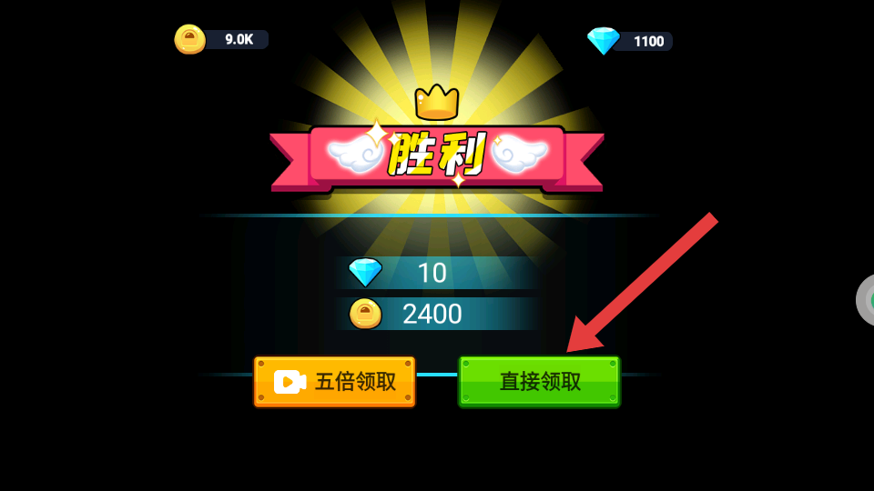 4、成功通关显示【胜利】后,点击【直接领取】按钮获取【钻石】【金币】等奖励。