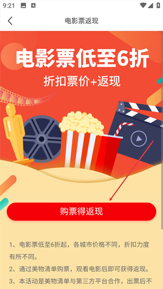 3、进入【电影票返现】页面,点击页面中的【购票得返现】按钮。