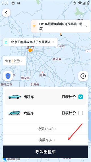 4、选择车型(如出租车),点击“呼叫出租车”按钮发起行程预约。