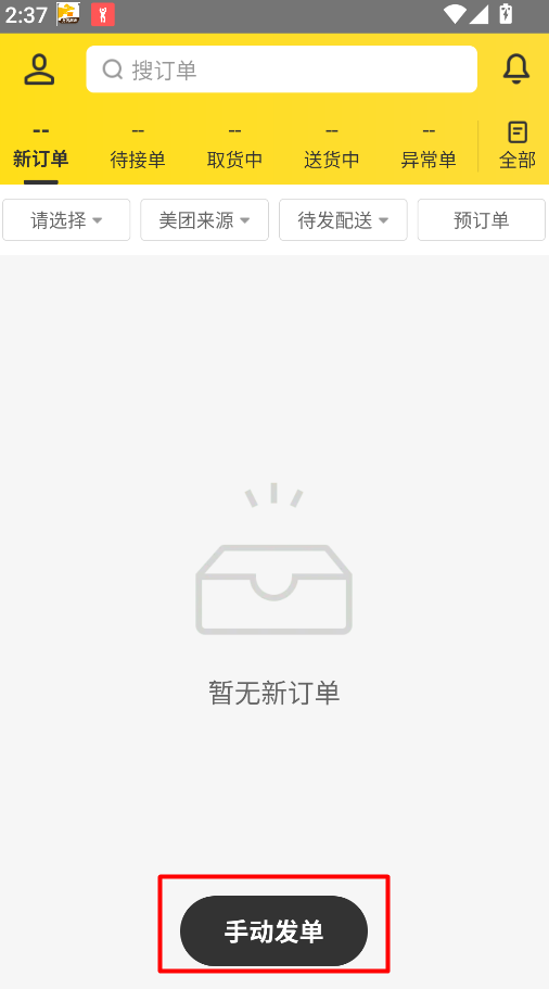 3、在首页找到 “新订单” + “手动发单” 按钮,点击进入下单页面;