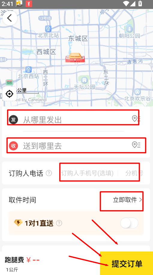 4、依次填写出发地点、送达地址、订购人联系电话、取件时间等信息,确认无误后提交订单。