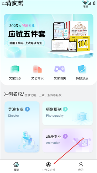 1、打开背文常,在首页可点击【文常知识】【文艺常识】【文常闯关】【传媒热点】等模块,学习相关知识。