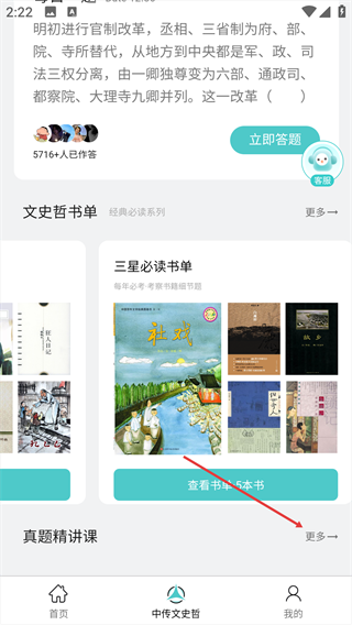 2、在【中传文史哲】页面,找到“真题精讲课”板块右侧的【更多】按钮并点击。
