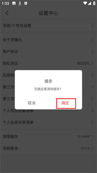 4、点击【清理缓存】后,会弹出【提示】弹窗询问是否确定清除,点击【确定】即可完成缓存清理操作。