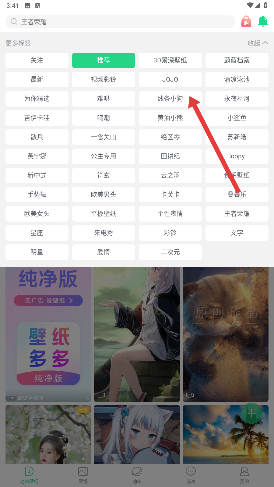 2、在展开的标签中,点击【线条小狗】标签,进入对应主题的壁纸集合哦。