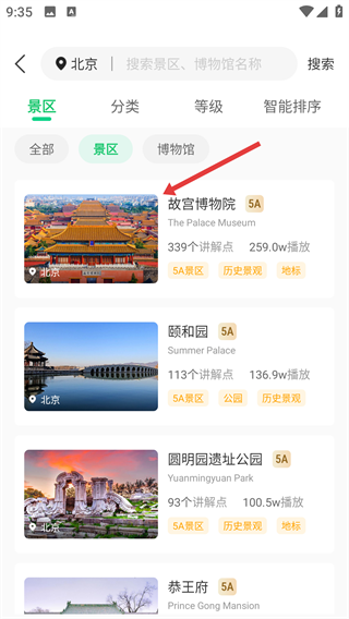 3、在景区列表里,我们选择【故宫博物院】,可查看其339个讲解点等详细信息哦。