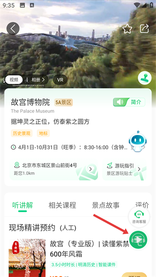 4、进入景点详情页,我们点击右下角绿色播放按键,就能收听【故宫博物院】的讲解,深入了解其历史啦。