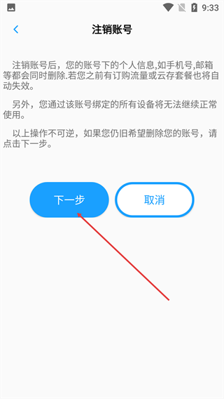 4、确认注销后个人信息删除、绑定设备失效等不可逆影响,点击【下一步】继续注销操作。