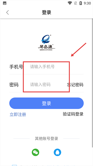 3、进入【登录】页面后,在输入框中填写【手机号】和【密码】。