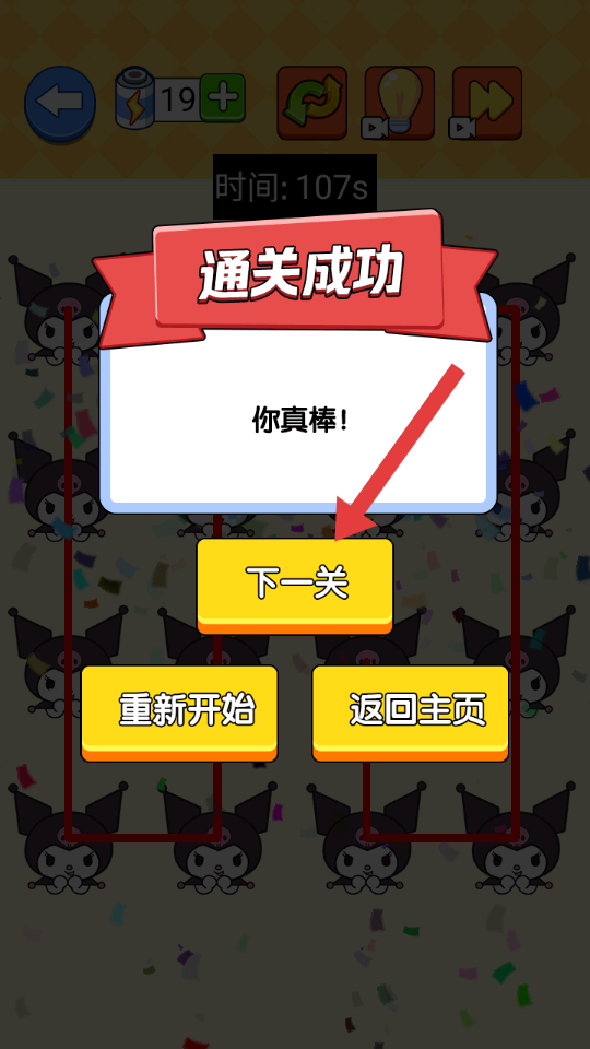 4、成功在规定时间内连接完所有需要连接的图案后,会显示【通关成功】提示,点击【下一关】按钮进入下一关卡。