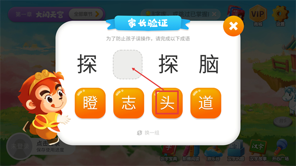 2、触发【家长验证】弹窗后,需完成成语填空(如选择【头】字),以此防止孩子误操作,完成后可继续后续操作。