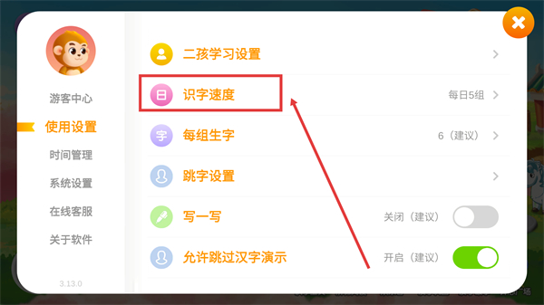 1、接着进入设置中心,在「使用设置」中可以设置二孩模式、每日目标、每组生字、跳字设置等等。