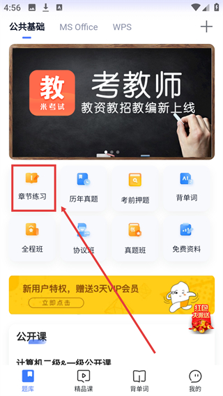 1、在【题库】页面,找到【章节练习】选项并点击,可进入章节练习页面选择对应学习模块。