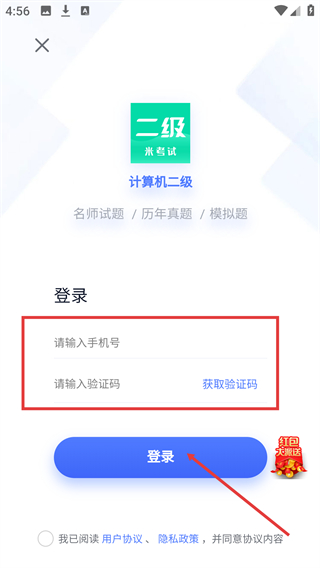4、操作后弹出登录界面,需在【请输入手机号】框填号码,获取并填验证码,勾选协议后点【登录】完成登录。