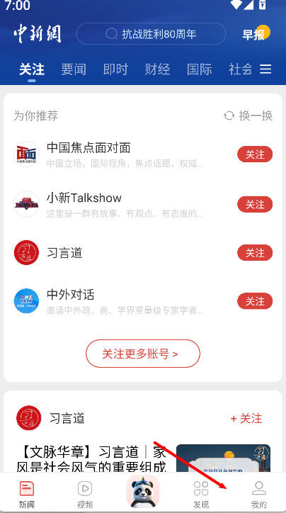 1、进入《中国新闻网》app首页后,点击界面右下角的“我的”选项,进入个人中心页面。