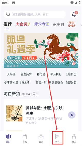 1、在首页点击底部导航栏的【学习】选项,可进入学习页面,查看课程打卡等学习相关内容。