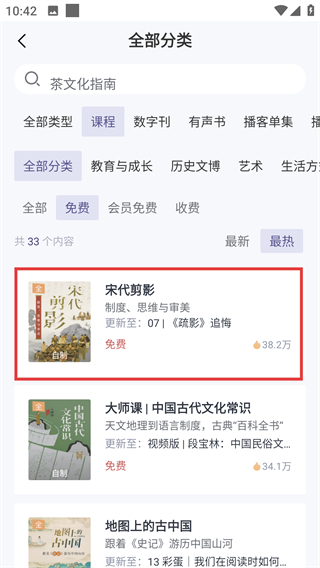 4、筛选后可看到如【宋代剪影】这类免费课程,点击即可查看课程详情,参与对应内容的学习。