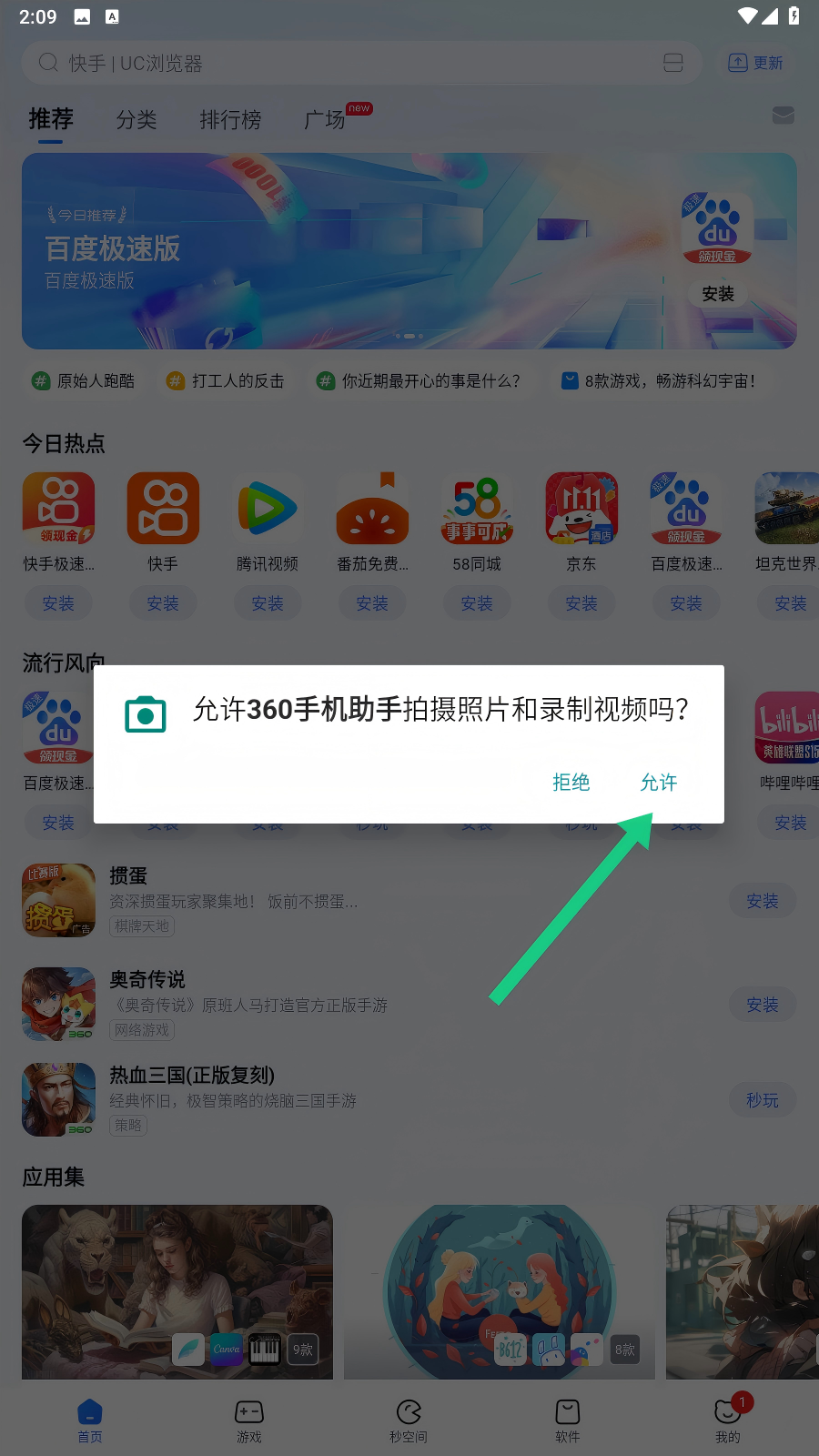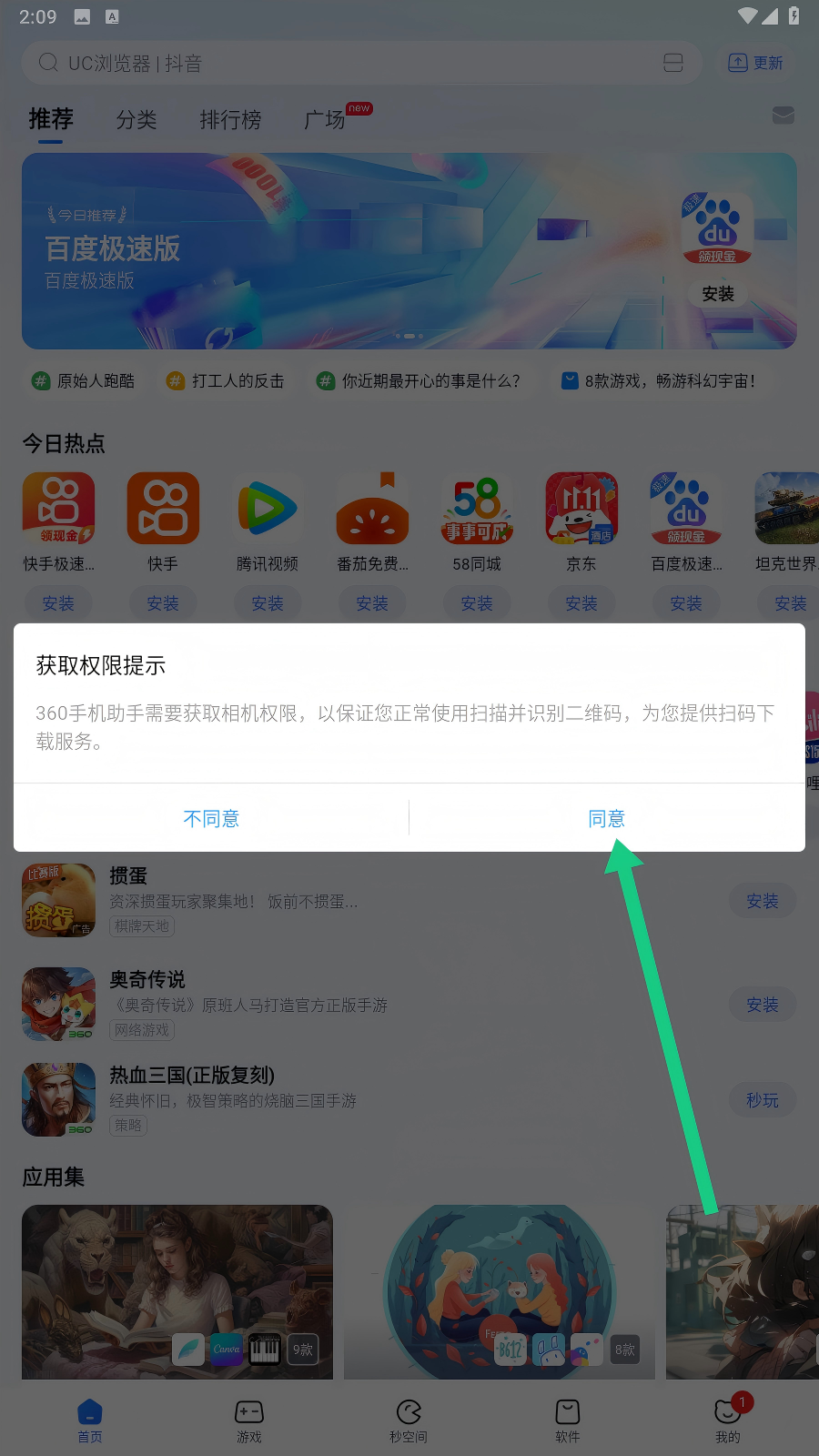 2、在获取权限提示弹窗中,点击【同意】,允许360手机助手获取相机权限,为扫码功能铺路哟。