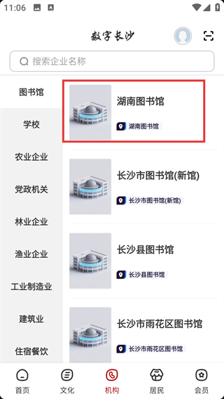 2、进入【机构】板块后,可搜索企业名称,能看到【湖南图书馆】【长沙市图书馆(新馆)】等机构选项,点击对应机构即可进入。