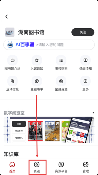 3、进入【湖南图书馆】页面,找到底部的【资讯】按钮点击,可查看相关动态。
