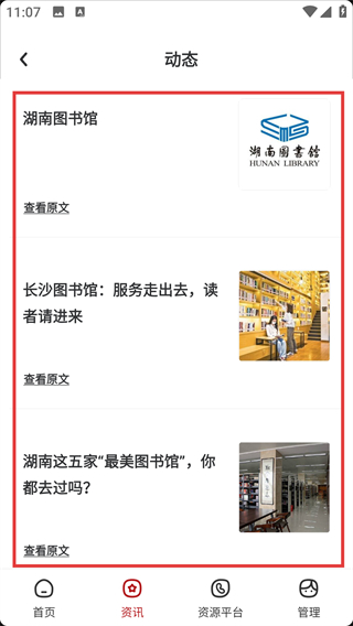 4、在【资讯】对应的动态页面,能看到【湖南图书馆】【长沙图书馆】等发布的内容,点击【查看原文】可了解详细信息。