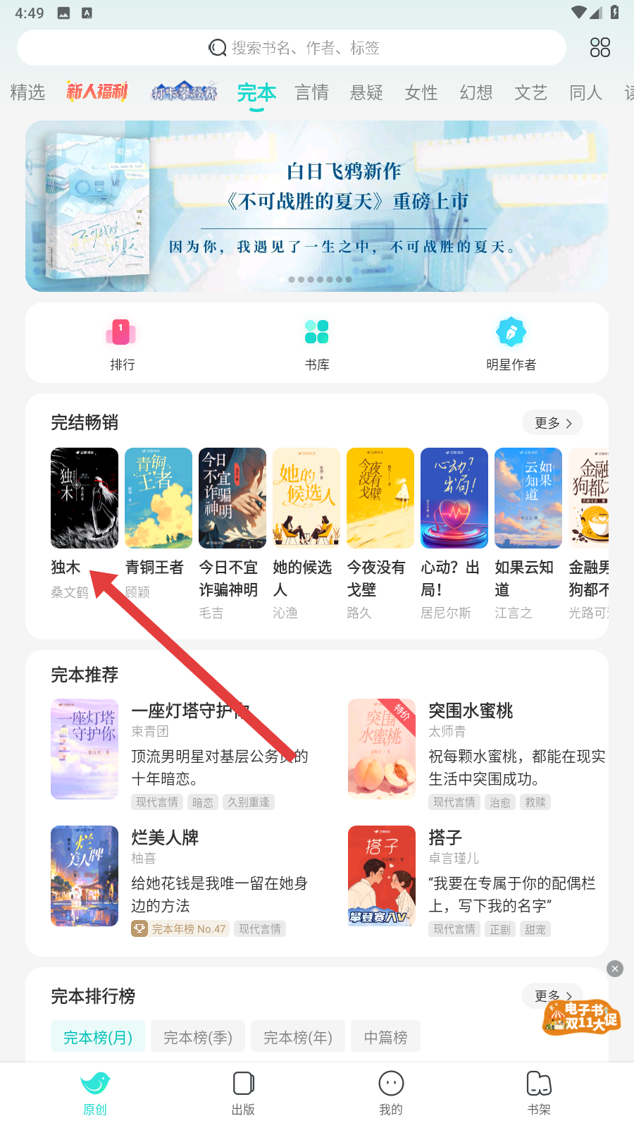 1、打开豆瓣阅读【原创】页面,在完结畅销板块找到如【独木】书籍,点击进入,为听书做好准备哦。