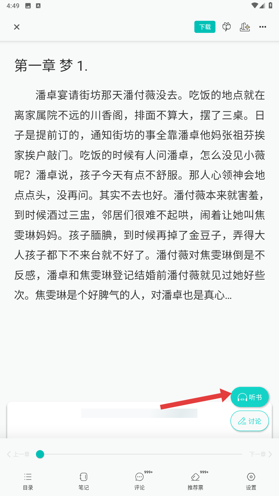 3、在阅读界面,点击【听书】按钮,进入朗读设置界面,即将开启书籍聆听之旅呢。