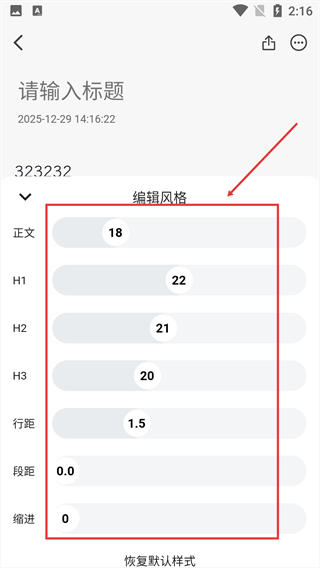4、在编辑风格界面,可调整正文字号、H标题字号、行距等样式参数,自定义笔记格式。