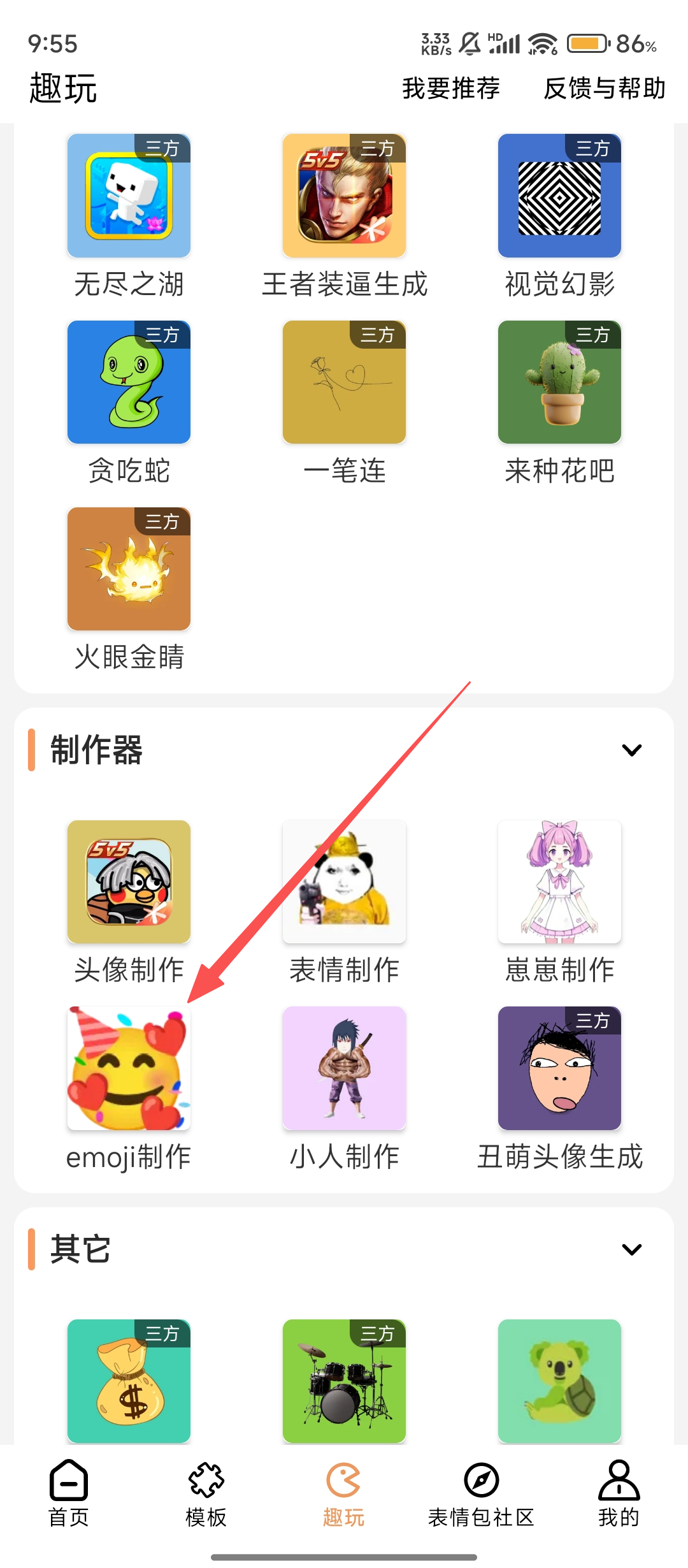 2、进入【趣玩】后,找到【制作器】区域的【emoji制作】,点击它就能开启专属表情的创作之旅啦。
