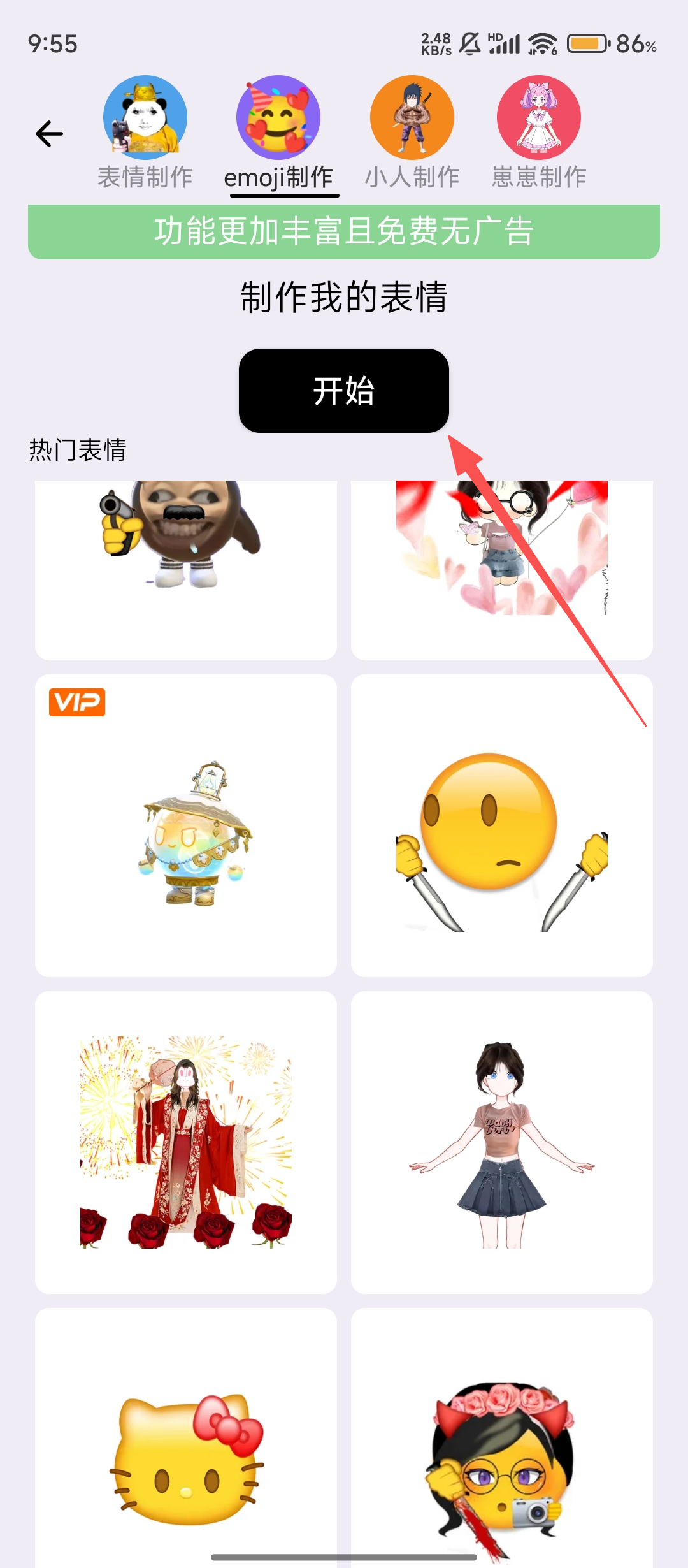 3、进入【emoji制作】后,点击【开始】按钮,就能在热门表情中挑选或自定义创作专属表情包,趣味十足哦。