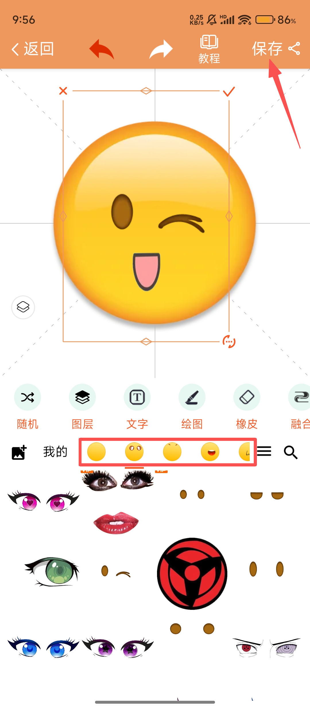 4、制作好表情包后,可利用图层、文字等功能优化,完成后点击右上角【保存】,你的搞怪表情就可以分享啦。