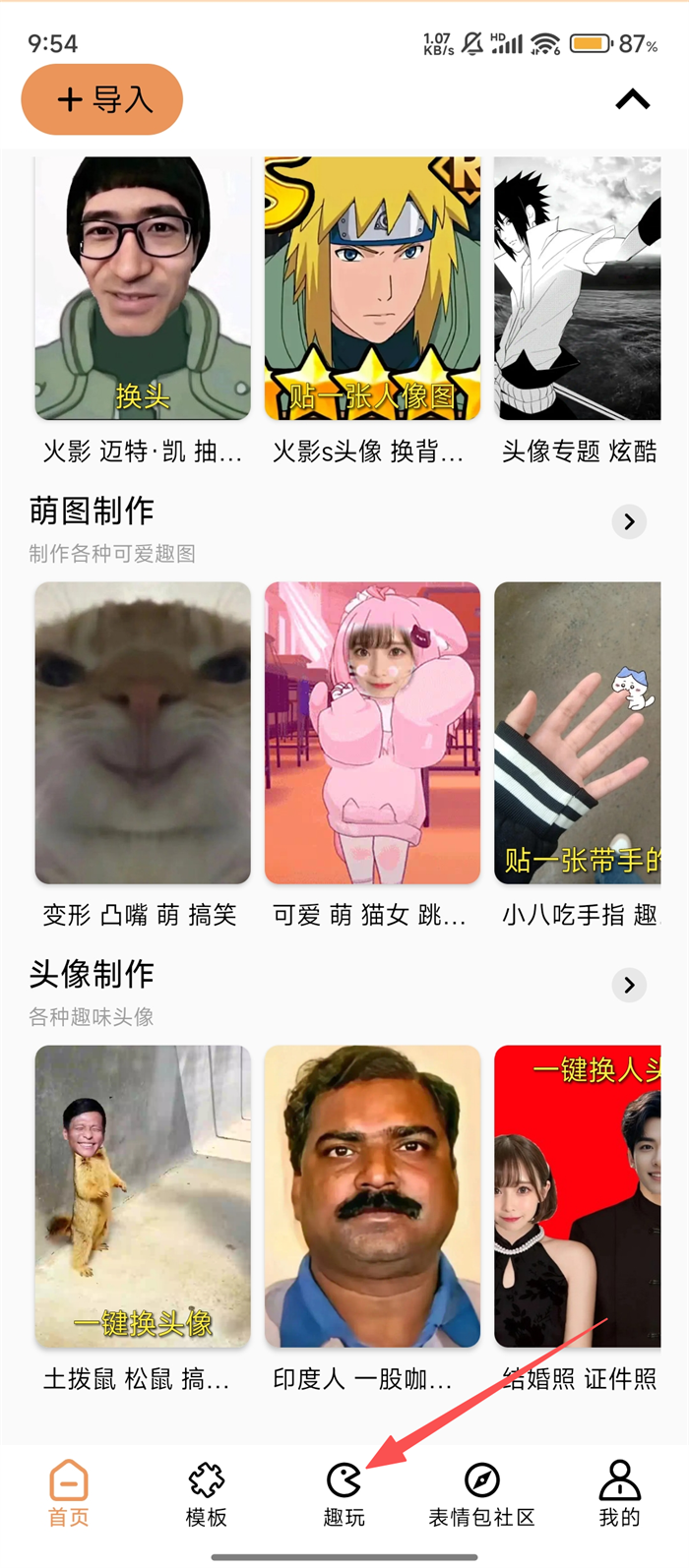 1、打开暴走P图,点击底部【趣玩】入口,这里有头像、萌图等多样玩法,想搞怪创作就从这开始探索吧。