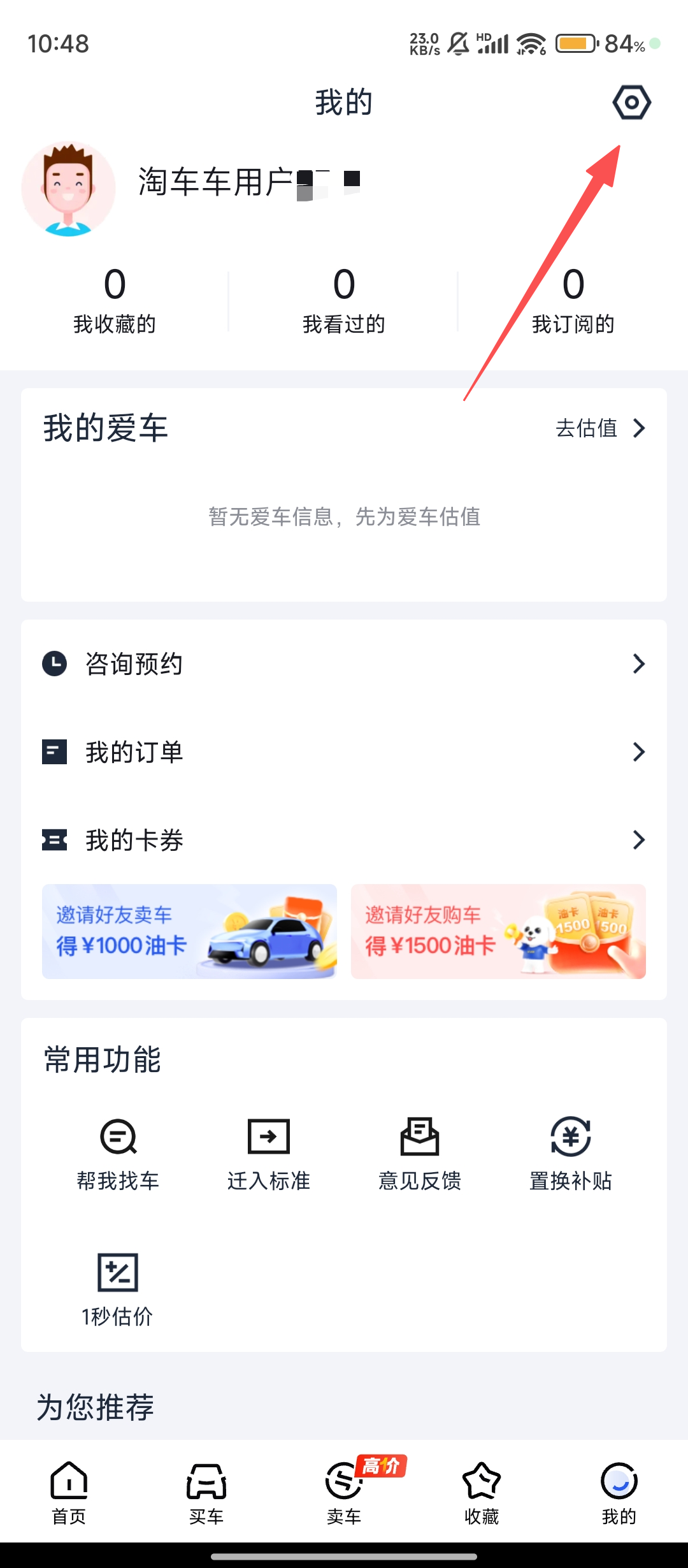 1、打开淘车车进入【我的】页面,点击右上角设置图标,进入设置界面开启账号注销流程哦。