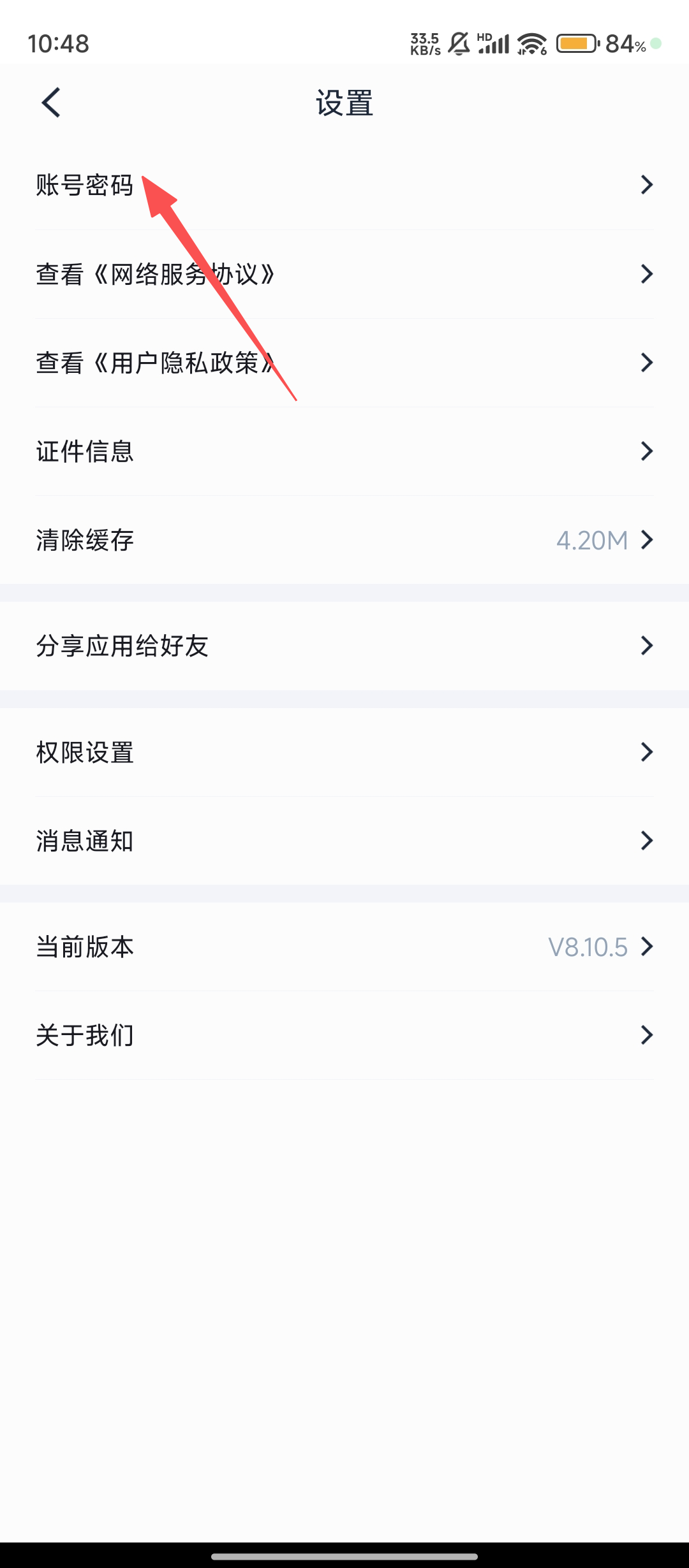 2、在设置页面找到【账号密码】选项并点击,进入淘车车账号相关操作页面啦。
