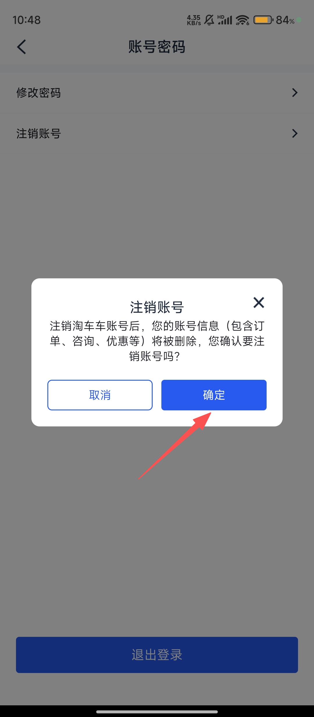 4、点击注销账号后,在弹出的确认弹窗中点击【确定】,就能完成淘车车账号的注销啦。