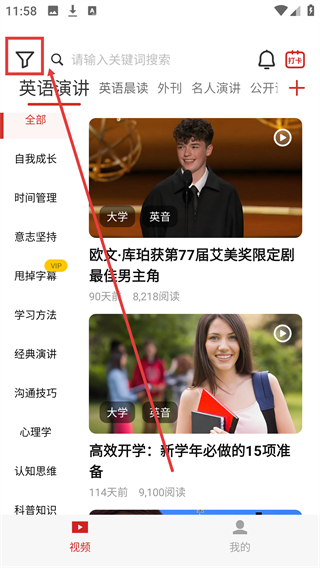 1、进入英语演讲页面后,点击左上角的筛选图标,可打开筛选内容界面,对视频内容进行条件筛选。