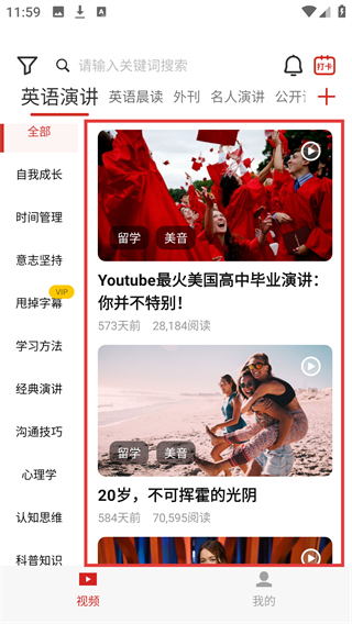 4、应用筛选条件后,页面将展示符合【留学-美音】条件的英语演讲视频,可直接查看相关内容。