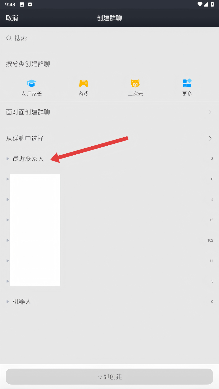 3、到了【创建群聊】页面,能看到【最近联系人】这类选项,从这里挑选要拉进群的好友,方便得很。