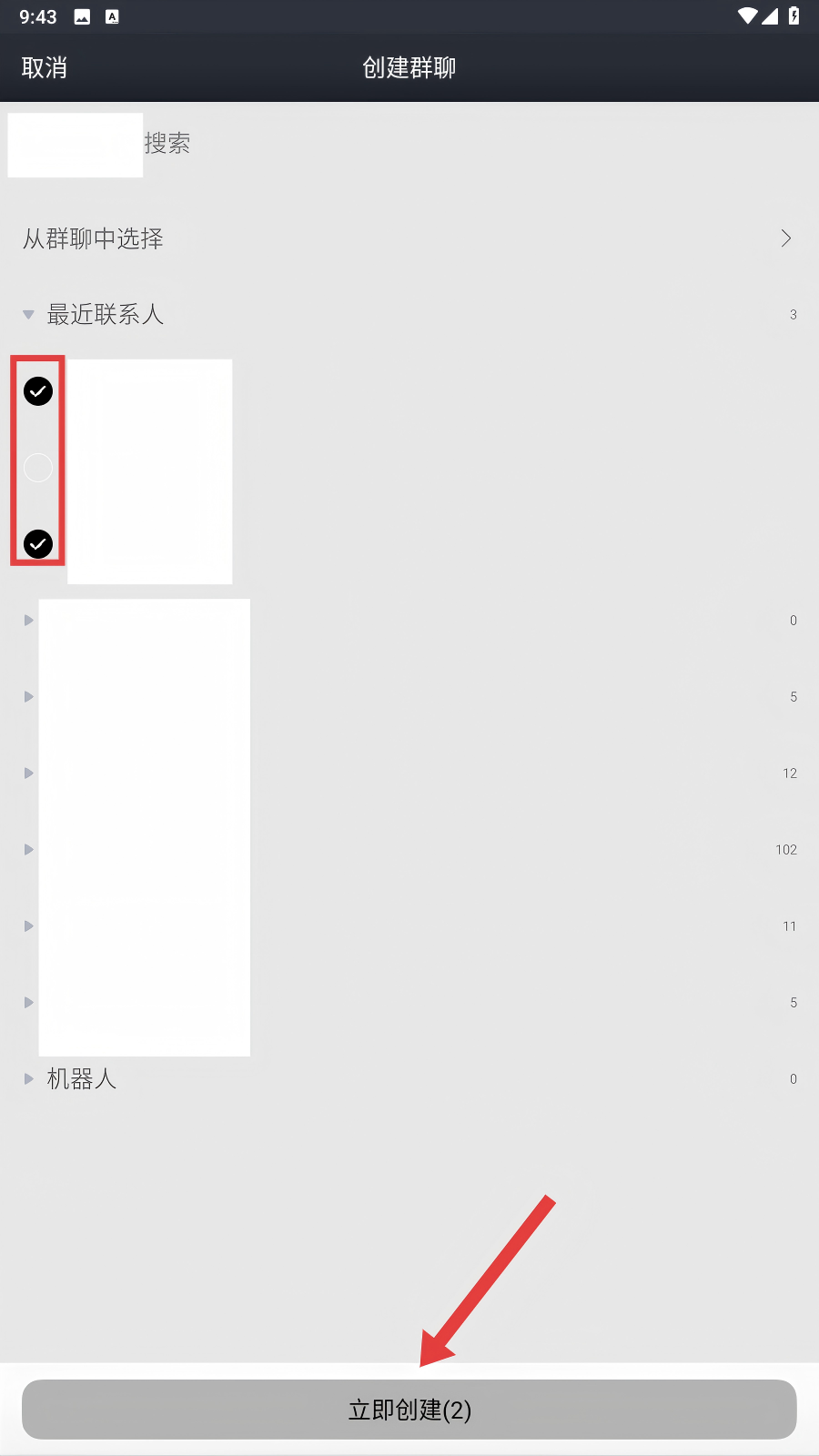 4、选好要加群的好友后,瞅准底部的【立即创建】按钮点一下,群就创建好啦,快叫上好友聊天吧。