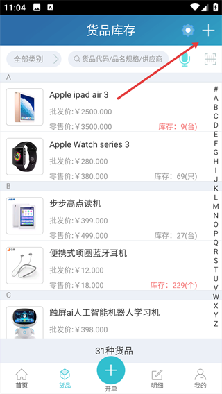 2、进入货品库存页面后,点击右上角的“+”按钮。