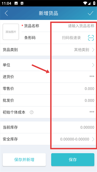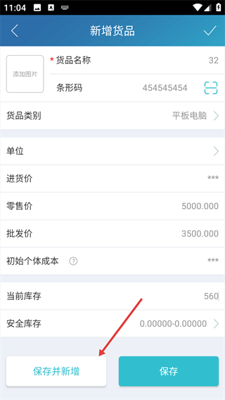 4、信息填写完成后,点击页面底部的【保存并新增】按钮,即可完成新货品的添加。