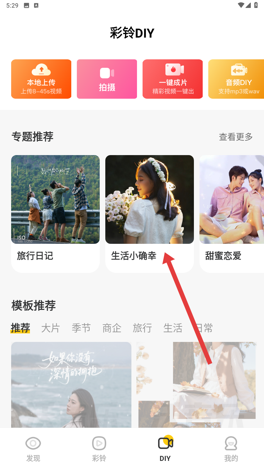 2、在彩铃DIY页面,选择专题推荐里的【生活小确幸】模板,点击进入,朝着专属彩铃又迈进一步啦。