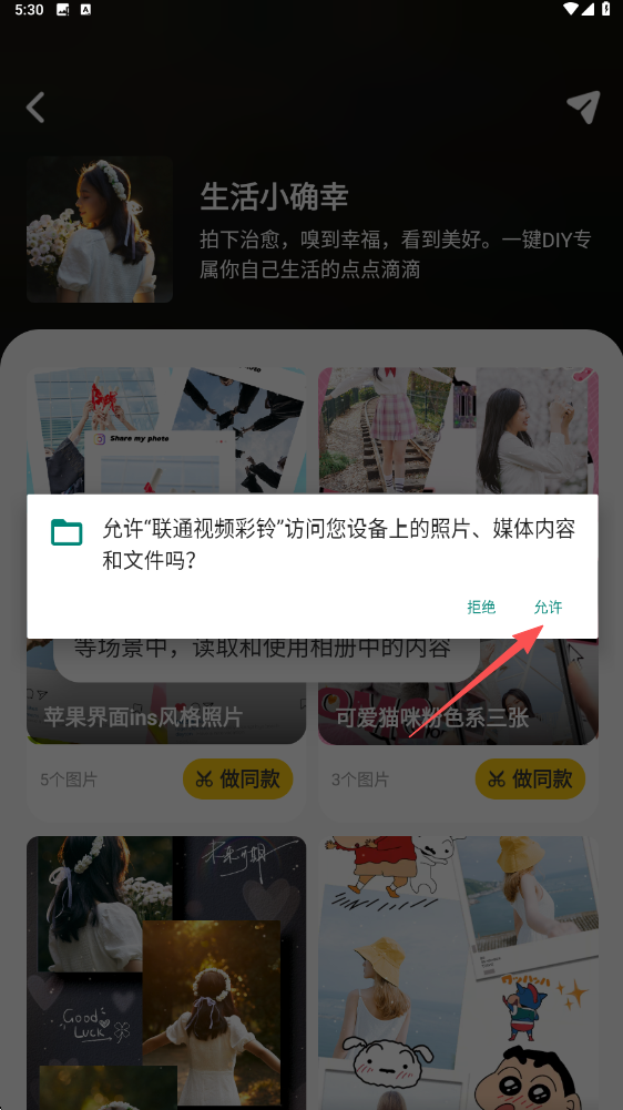 3、进入模板后,弹出权限请求时点击【允许】,让应用访问设备照片-媒体内容和文件,为彩铃制作准备素材哟。