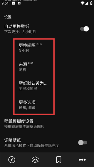 3、开启【自动更换壁纸】后,会弹出包含更换间隔、来源等选项的菜单,我们可按需调整这些参数,定制自动换壁纸规则。