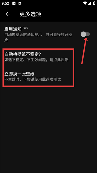 4、进入更多选项界面,若自动换壁纸有问题,可点【立即换一张壁纸】测试,也能反馈不稳定问题,保障功能正常使用。