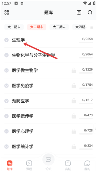 1、打开医考帮App,进入题库页面,选定【大二期末】标签下的【生理学】科目哦。