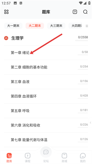2、展开【生理学】的章节列表,点击【第一章-绪论】进入对应试题板块。