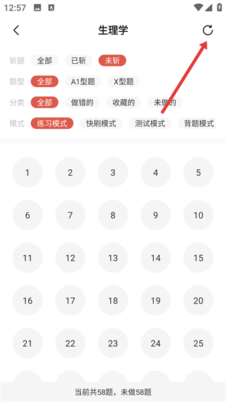 3、进入生理学题目页后,点击右上角的【刷新】图标触发操作。