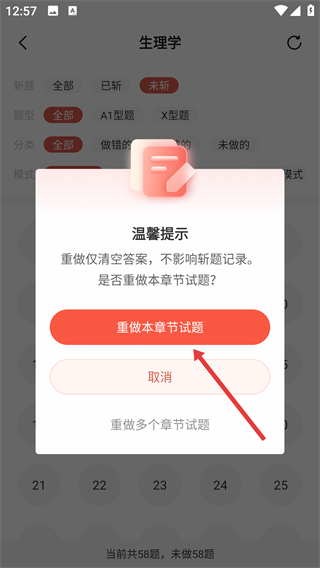 4、待温馨提示框弹出,点击【重做本章节试题】按钮就完成啦。