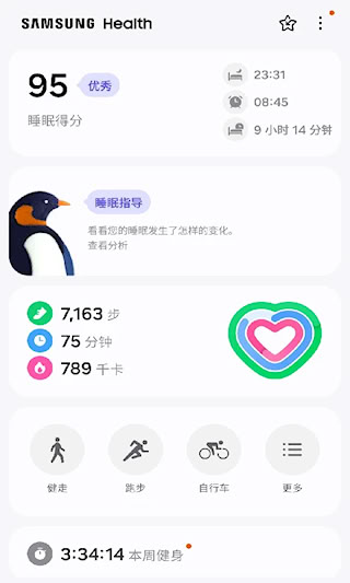 三星健康APP是一个智能健康管理应用,具备多维度数据采集、智能分析功能,能提供运动、睡眠、心率、压力等健康指标监测功能,依托传感器融合技术,可自动记录步数、运动距离、卡路里消耗等数据,支持手动录入饮食、饮水、用药等信息。具备20种运动模式识别算法,可精准区分跑步、游泳、瑜伽等不同活动类型,结合GPS定位与心率监测,生成多维度的运动效能分析报告。